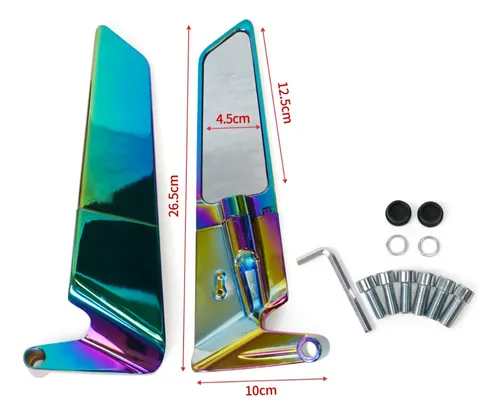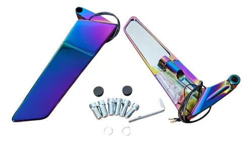 Espejos Alerón para motos Naked tornasol con Direccional universales adaptables a cualquier moto que tenga sus espejos en sistema de 1 tornillo pues incluye tornillería de 8 y 10 mm de rosca derecha y rosca contraría, es decir, incluye todos los tipos de tornillo que puede requerir tu moto sea de bajo o alto cilindraje sin importar la marca.